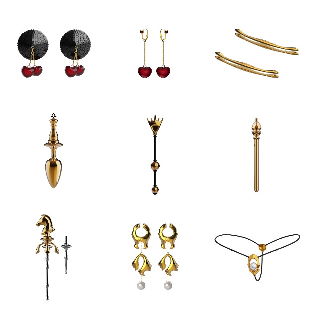 1. Коллекция "Вишенки" - это уникальный ассортимент пэстисов и зажимов для клитора, украшенных колокольчиками, чей звон напоминает мелодию струящейся воды и очаровывает своей красотой. 2. Коллекция Moist Eyes теперь пополнена зажимами для сосков, выполненными в форме кораллов, и клиторальными стрингами, украшенными жемчугом, чтобы добавить изысканности и чувственности. 3. Многофункциональный зажим, который может быть использован для языка, сосков, и мошонки, открывая новые горизонты удовольствия. 4. И, конечно, наша гордость - шахматная коллекция, которая включает в себя анальную пробку в форме Короля, вагинальные шарики в форме Королевы, мини-вибратор в виде Епископа и два уретральных зонда, представляющих собой фигуру Коня, для истинных ценителей роскоши.